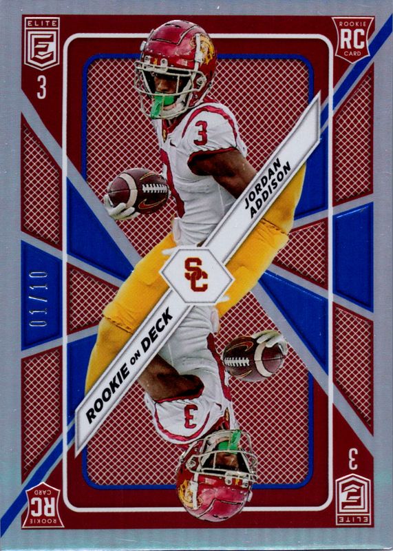 The Jordan Addison 2023 Elite #RD-7 Rookie on Deck - Blue /10 card in Raw condition has not changed in price in the last 30 days and was last sold for $6.38 .