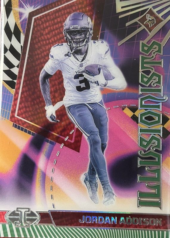 The Jordan Addison 2023 Illusions #16 Illusionists - Emerald Rookie card in Raw condition has not changed in price in the last 30 days and was last sold for $0.99 .