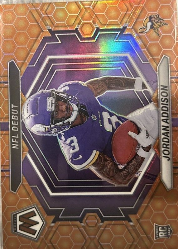 The Jordan Addison 2023 Mosaic #ND-14 NFL Debut - Honeycomb /(SSP) Rookie card in Raw condition has not changed in price in the last 30 days and was last sold for $35.00 .