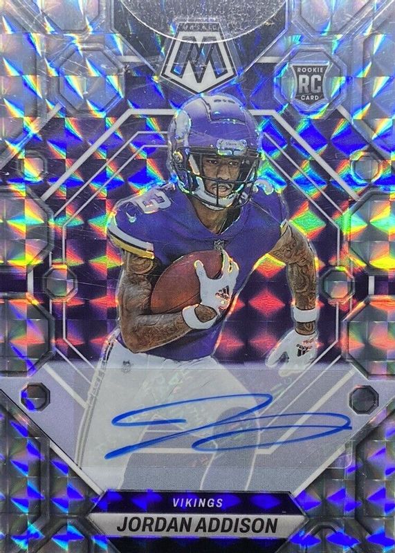 The Jordan Addison 2023 Mosaic #337 Rookie Autographs - Mosaic card in Raw condition has moved down -$20.00 (-40.0%) in the last 30 days and was last sold for $30.00 .