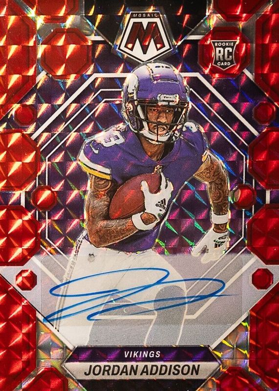2023 Panini Mosaic Jordan Addison Rookie Auto Red Mosaic #/199 Vikings Card #337