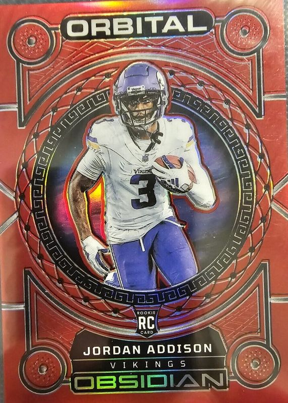 The Jordan Addison 2023 Obsidian #15 Orbital - Electric Etch Red Flood Rookie card in Raw condition has not changed in price in the last 30 days and was last sold for $12.04 .