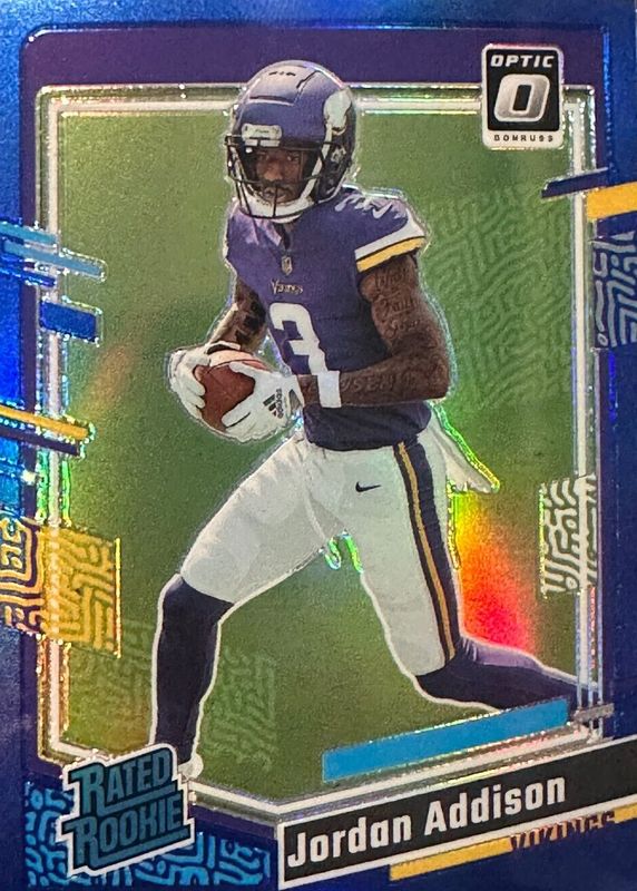 The Jordan Addison 2023 Optic #271 Blue /199 Rookie card in Raw condition has not changed in price in the last 30 days and was last sold for $14.00 .