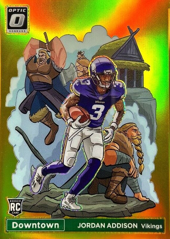 The Jordan Addison 2023 Optic #D-18 Downtown - Gold /10 Rookie card in Raw condition has not changed in price in the last 30 days and was last sold for $1,500.00 .