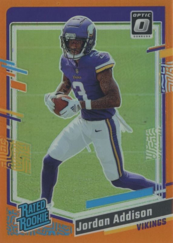 The Jordan Addison 2023 Optic #271 Orange /249 Rookie card in Raw condition has not changed in price in the last 30 days and was last sold for $9.95 .