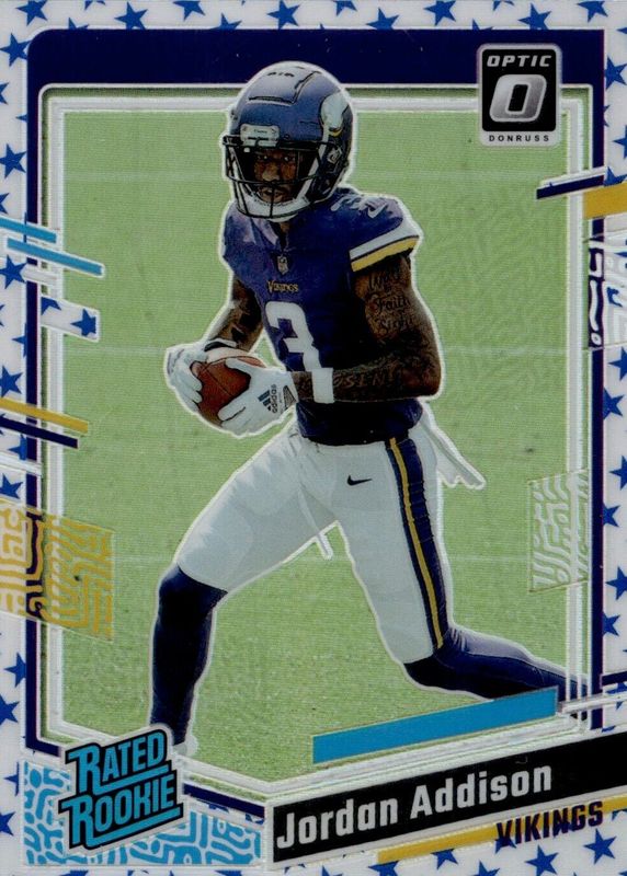 The Jordan Addison 2023 Optic #271 Stars /(SSP) Rookie card in Raw condition has not changed in price in the last 30 days and was last sold for $3.25 .