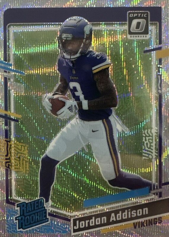 The Jordan Addison 2023 Optic #271 Wave /300 Rookie card in Raw condition has not changed in price in the last 30 days and was last sold for $2.13 .