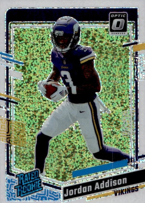 The Jordan Addison 2023 Optic #271 White Sparkle /(SSP) Rookie card in Raw condition has not changed in price in the last 30 days and was last sold for $110.50 .