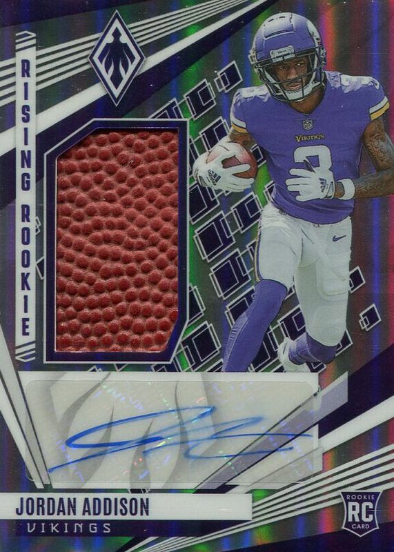 The Jordan Addison 2023 Phoenix #RMS-JAD Rising Rookie Material Signatures (/99) card in Raw condition has not changed in price in the last 30 days and was last sold for $45.00 .