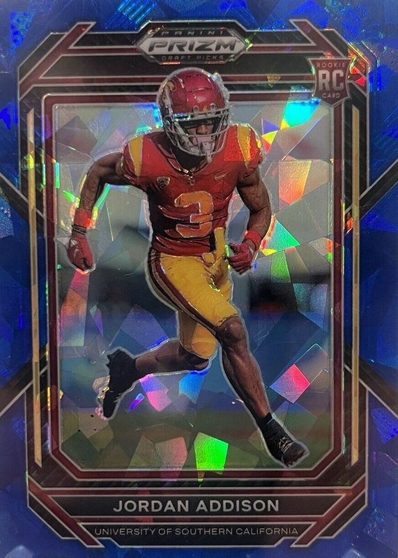 The Jordan Addison 2023 Prizm Draft Picks #136 Blue Ice /99 Rookie card in Raw condition has not changed in price in the last 30 days and was last sold for $4.99 .
