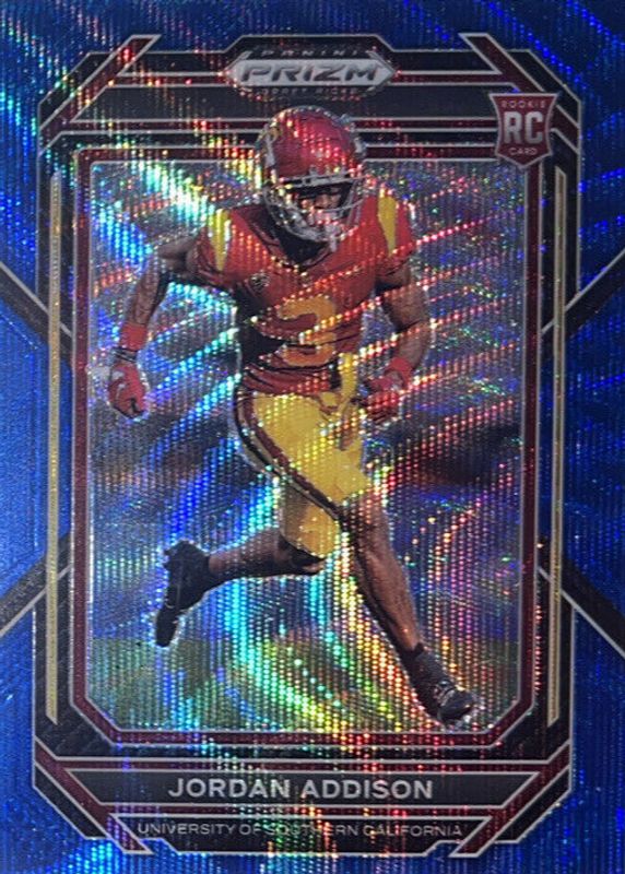 The Jordan Addison 2023 Prizm Draft Picks #136 Blue Wave /249 Rookie card in Raw condition has not changed in price in the last 30 days and was last sold for $4.85 .