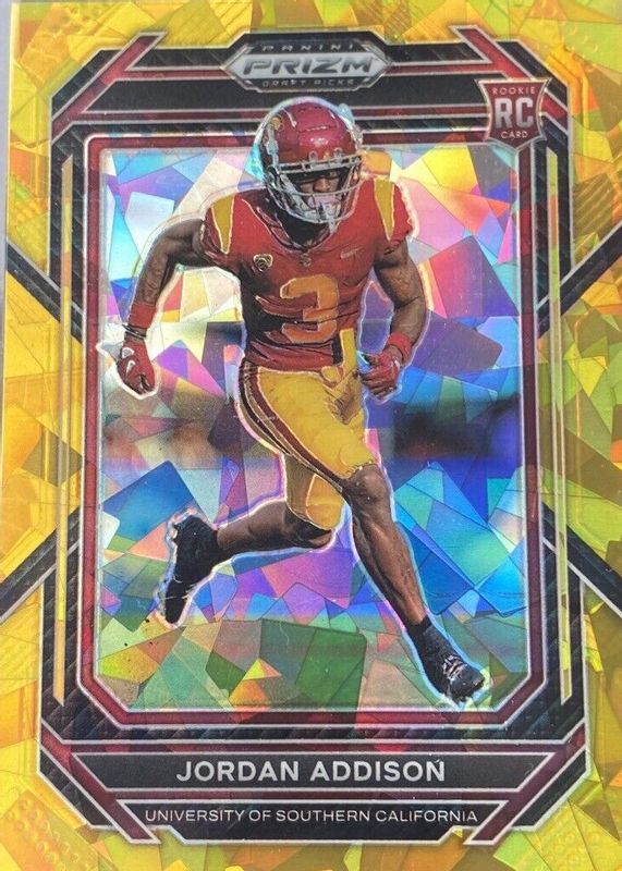 The Jordan Addison 2023 Prizm Draft Picks #136 Gold Ice Rookie card in Raw condition has moved up $0.01 (+1.0%) in the last 30 days and was last sold for $1.00 .