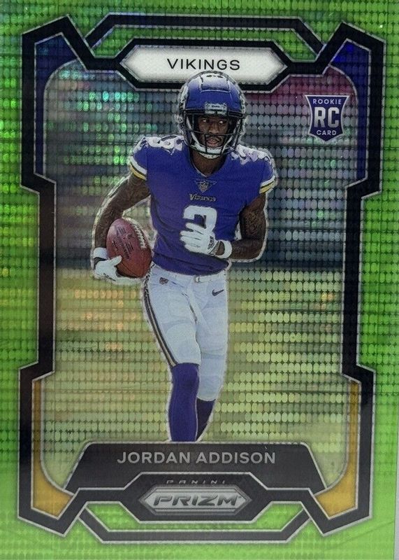 The Jordan Addison 2023 Prizm #368 Neon Green Pulsar Rookie card in Raw condition has moved up $1.00 (+100%) in the last 30 days and was last sold for $2.00 .