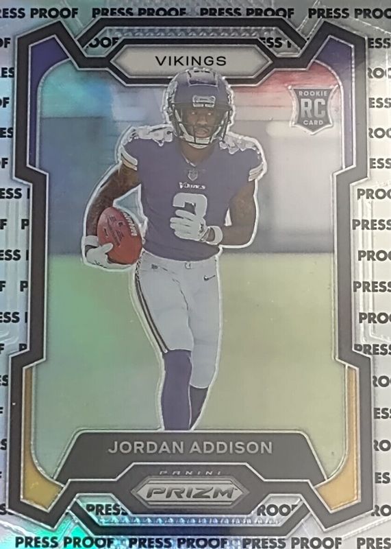 The Jordan Addison 2023 Prizm #368 Press Proof /(SSP) Rookie card in Raw condition has not changed in price in the last 30 days and was last sold for $150.00 .