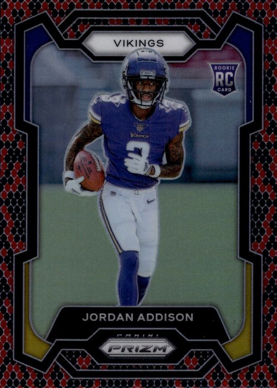 The Jordan Addison 2023 Prizm #368 Snakeskin /(SSP) Rookie card in Raw condition has not changed in price in the last 30 days and was last sold for $170.00 .