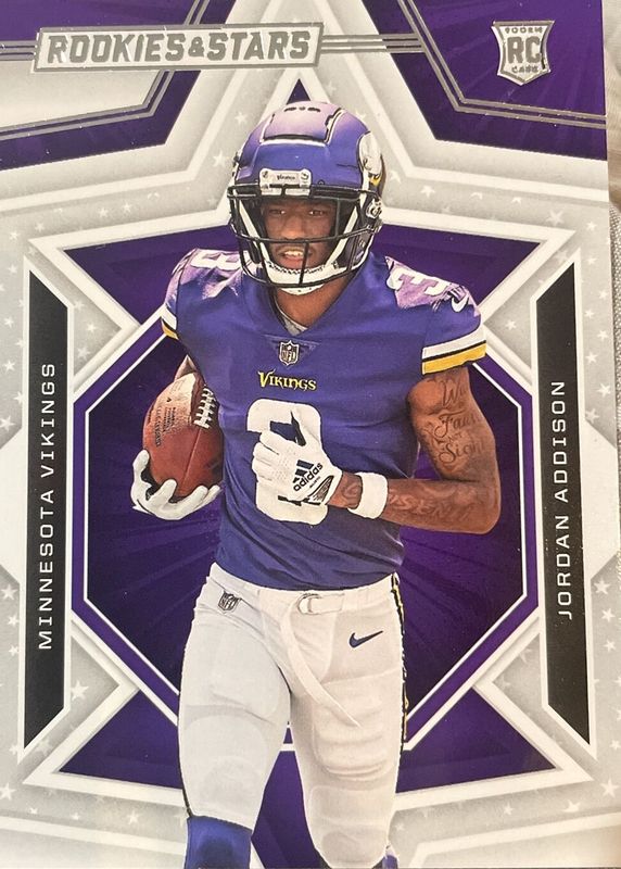 The Jordan Addison 2023 Rookies & Stars #157 Base card in Raw condition has not changed in price in the last 30 days and was last sold for $0.99 .