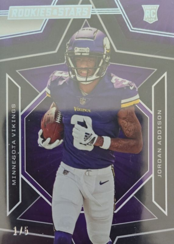 The Jordan Addison 2023 Rookies & Stars #157 Black & Blue /5 card in Raw condition has not changed in price in the last 30 days and was last sold for $40.00 .