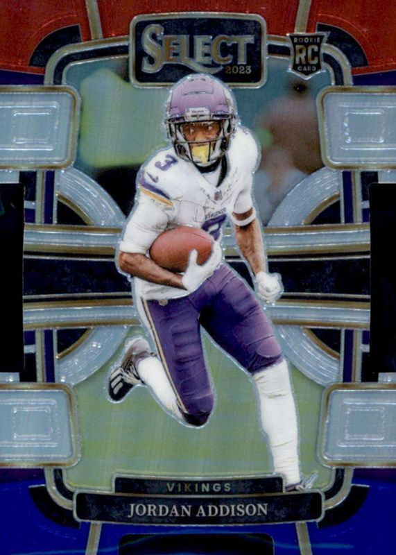 The Jordan Addison 2023 Select #66 Concourse Red & Blue Die-Cut Rookie card in Raw condition has moved down -$0.99 (-49.7%) in the last 30 days and was last sold for $1.00 .
