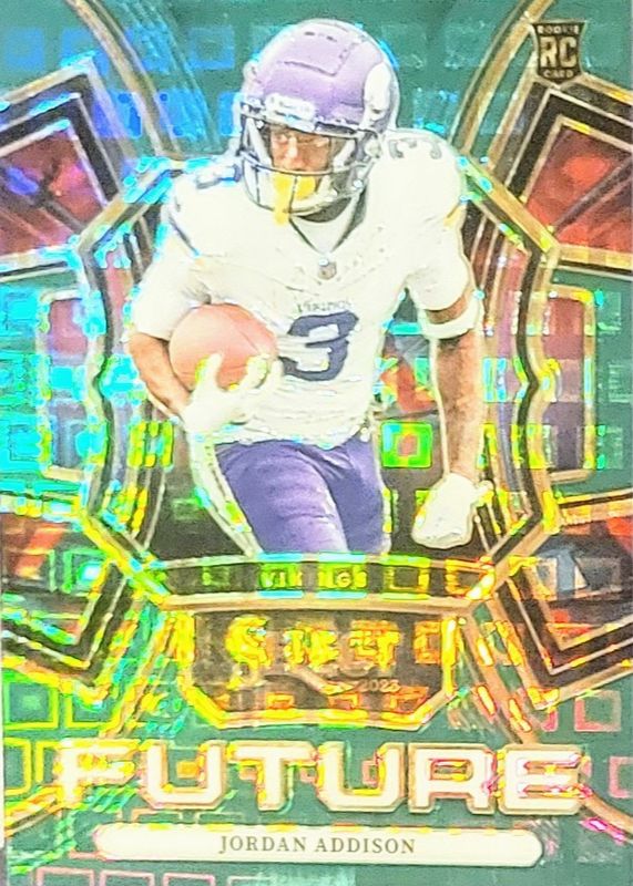 The Jordan Addison 2023 Select #FUT-JAD Select Future - Green /5 Rookie card in Raw condition has not changed in price in the last 30 days and was last sold for $110.00 .