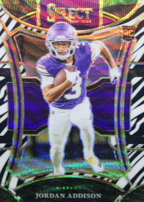 The Jordan Addison 2023 Select #462 Suite Level Zebra /(SSP) Rookie card in Raw condition has not changed in price in the last 30 days and was last sold for $102.50 .