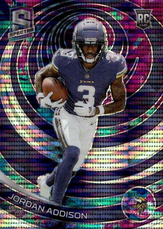 This card is 1 of 41 Jordan Addison's card variations in the 2023 Spectra set being tracked by Sports Card Investor, including Base, Silver, Hyper /75, Interstellar /60, and Neon Blue Die-Cut /50.