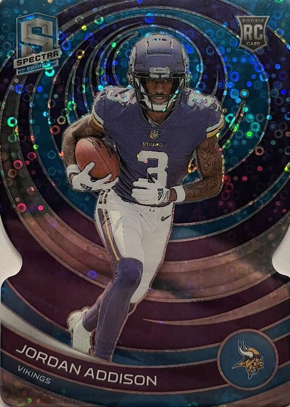 The Jordan Addison 2023 Spectra #129 Neon Blue Die-Cut /50 Rookie card in Raw condition has not changed in price in the last 30 days and was last sold for $14.99 .