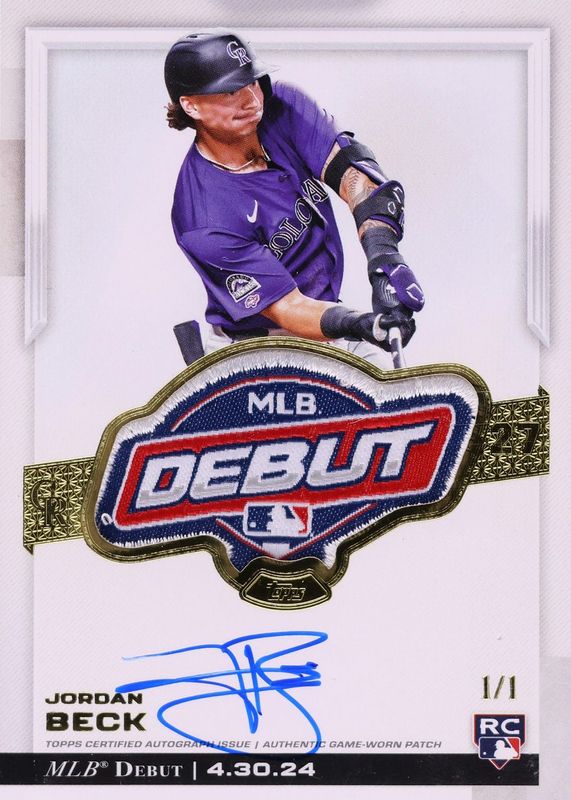 The Jordan Beck 2024 Topps Chrome Update #RDPA-JB MLB Debut Patch Autograph /1 Rookie card in Raw condition has not changed in price in the last 30 days and was last sold for $6,250.00 .