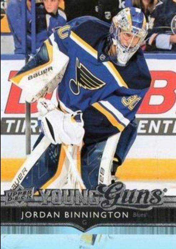 The Jordan Binnington 2014 Upper Deck #469 Young Guns Base Rookie card is 1 of 12 Jordan Binnington's card variations in the 2014 Upper Deck set being tracked by Sports Card Investor, including #235 Young Guns Base, #C230 Young Guns Canvas, #235 Young Guns - Acetate, #235 Young Guns - UD Exclusives /100, and #469 Young Guns - UD Exclusives /100.