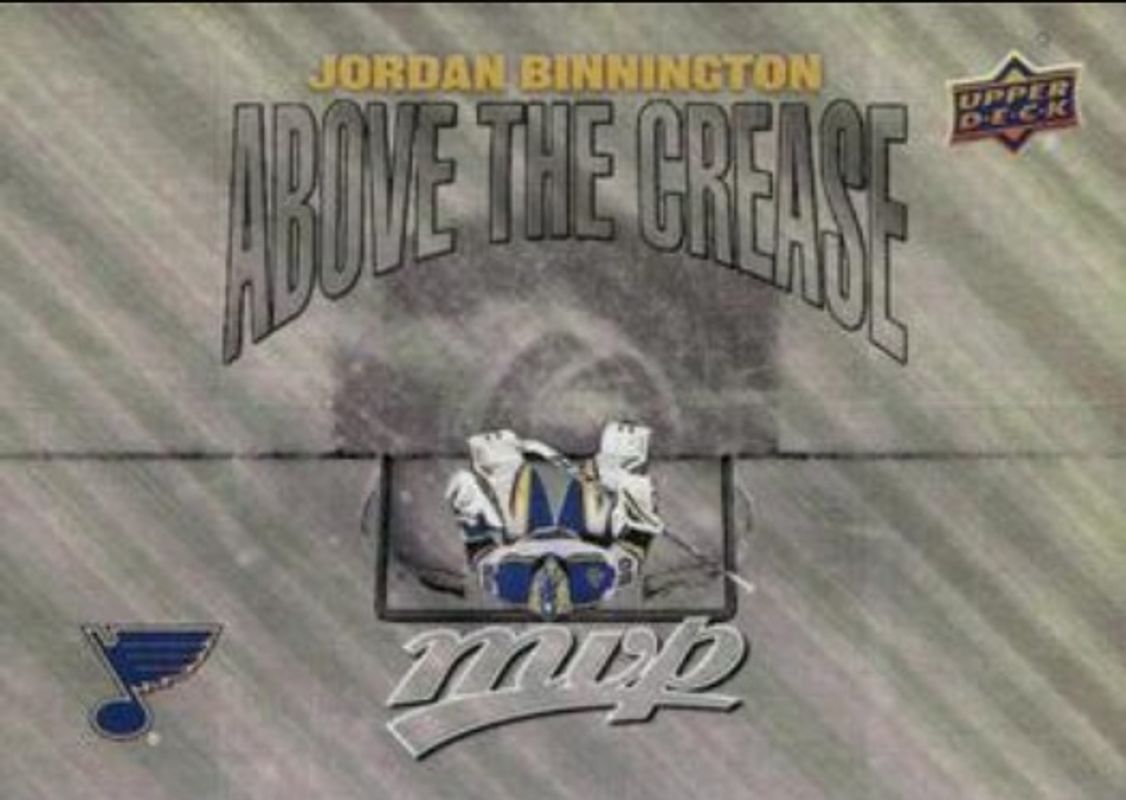 The Jordan Binnington 2024 Upper Deck MVP #AC-17 Above the Crease card is 1 of 12 Jordan Binnington's card variations in the 2024 Upper Deck MVP set being tracked by Sports Card Investor, including Base, Gold Script, Silver Script, Super Script /25, and Printing Plates Black /1.