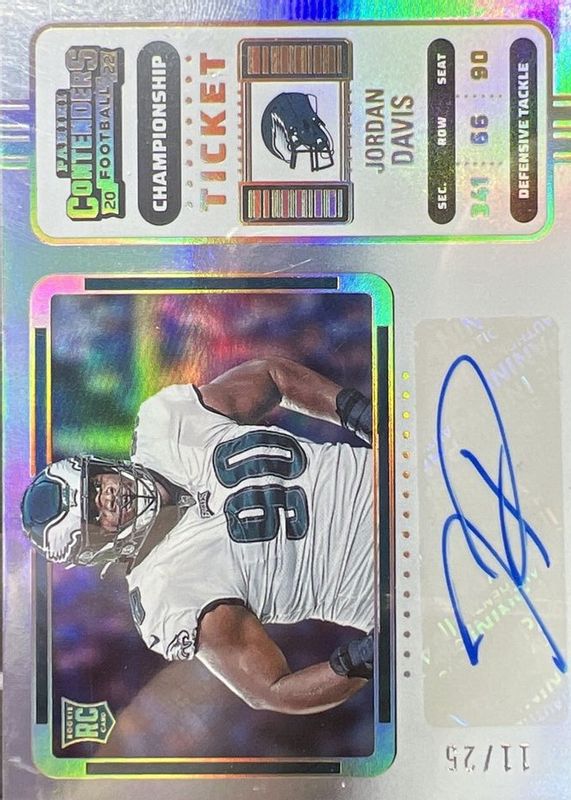 This card is 1 of 26 Jordan Davis' card variations in the 2022 Contenders set being tracked by Sports Card Investor, including Rookie Ticket Auto, Rookie Ticket Auto - Red Zone Ticket, Rookie Ticket Auto - Ticket Stub (/90), Rookie Ticket Auto - Wild Card, and Rookie Ticket Auto - Playoff Ticket /99.