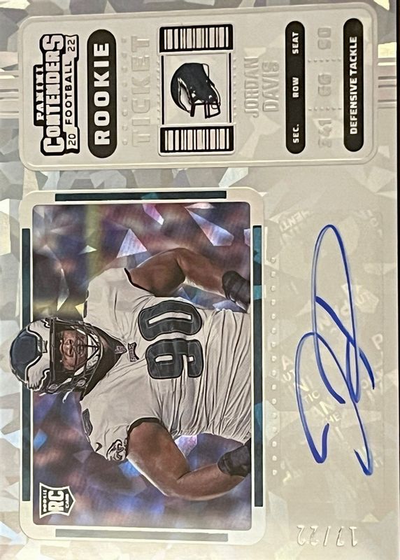 This card is 1 of 26 Jordan Davis' card variations in the 2022 Contenders set being tracked by Sports Card Investor, including Rookie Ticket Auto, Rookie Ticket Auto - Red Zone Ticket, Rookie Ticket Auto - Ticket Stub (/90), Rookie Ticket Auto - Wild Card, and Rookie Ticket Auto - Playoff Ticket /99.