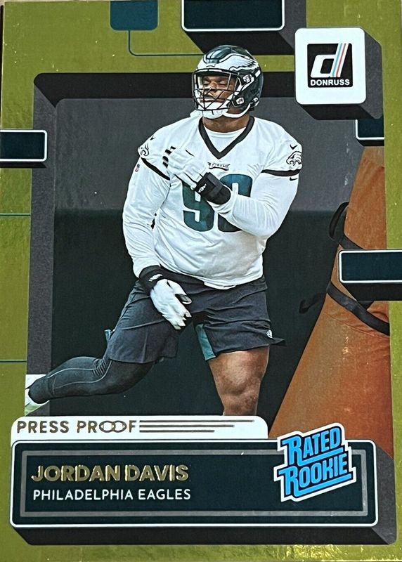This card is 1 of 9 Jordan Davis' card variations in the 2022 Donruss set being tracked by Sports Card Investor, including Press Proof Silver /100, Press Proof Silver Die-Cut /75, Press Proof Gold Die-Cut /25, Press Proof Black /10, and Press Proof Black Die-Cut /1.