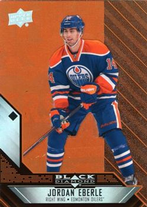 The Jordan Eberle 2014 Upper Deck Black Diamond #16 Orange card is 1 of 4 Jordan Eberle's card variations in the 2014 Upper Deck Black Diamond set being tracked by Sports Card Investor, including Base, Ruby /50, and Sapphire /1.