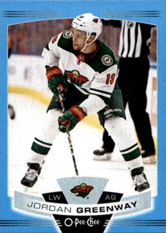 The Jordan Greenway 2019 O-Pee-Chee #253 Blue Border card is 1 of 8 Jordan Greenway's card variations in the 2019 O-Pee-Chee set being tracked by Sports Card Investor, including Base, Gold Border, Red Border, Red Border Blank Back, and Retro.