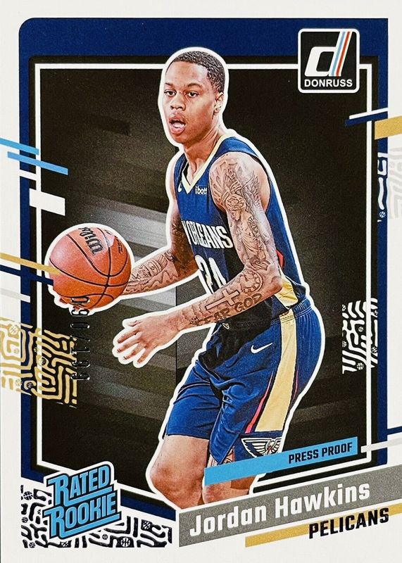 The Jordan Hawkins 2023 Donruss #219 Press Proof Purple /199 Rookie card in Raw condition has not changed in price in the last 30 days and was last sold for $1.25 .