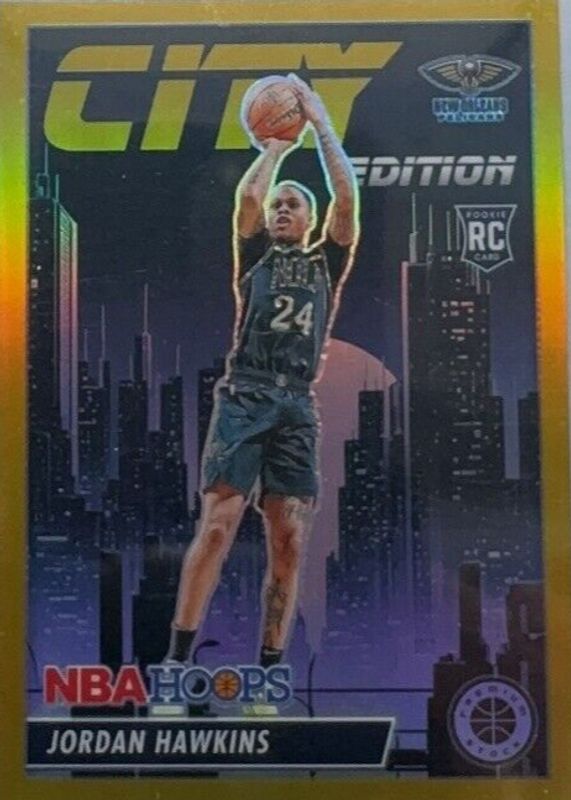 The Jordan Hawkins 2023 Hoops Premium Stock #7 City Edition - Gold /10 Rookie card in Raw condition has not changed in price in the last 30 days and was last sold for $80.00 .