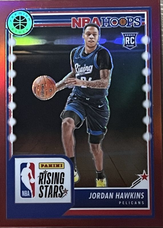 The Jordan Hawkins 2023 Hoops Premium Stock #288 Rising Stars - Red /275 Rookie card in Raw condition has not changed in price in the last 30 days and was last sold for $0.99 .