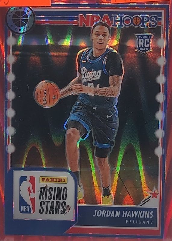 The Jordan Hawkins 2023 Hoops Premium Stock #288 Rising Stars - Red Seismic /199 Rookie card in Raw condition has not changed in price in the last 30 days and was last sold for $4.00 .