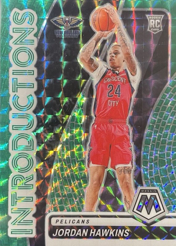 The Jordan Hawkins 2023 Mosaic #14 Introductions - Teal /75 Rookie card in Raw condition has not changed in price in the last 30 days and was last sold for $1.25 .