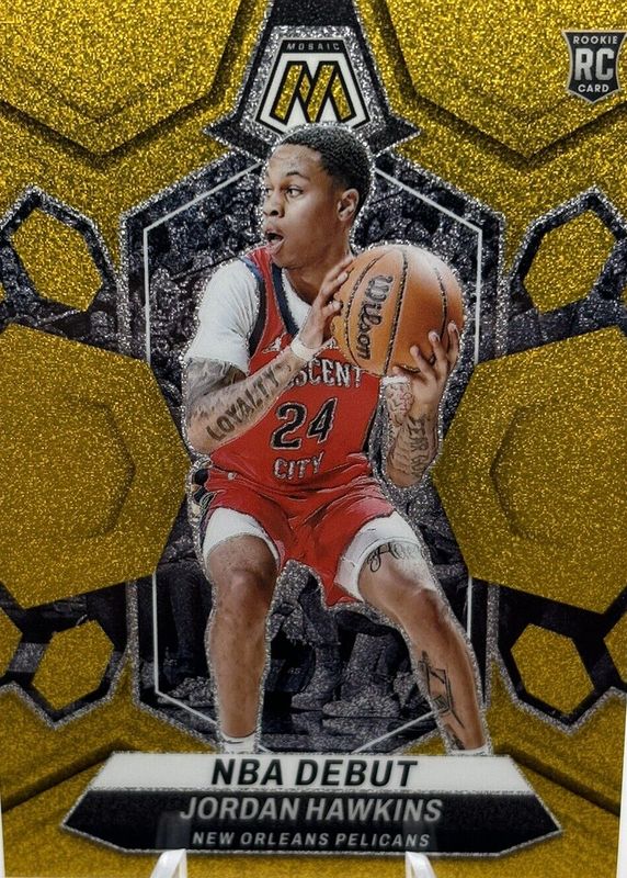 The Jordan Hawkins 2023 Mosaic #253 NBA Debut - Gold Glitter /5 Rookie card in Raw condition has not changed in price in the last 30 days and was last sold for $270.00 .