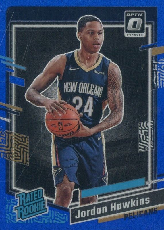 This card is 1 of 79 Jordan Hawkins' card variations in the 2023 Optic set being tracked by Sports Card Investor, including Base, Blue Velocity, Checkerboard, Choice Red & Green, and Fast Break.