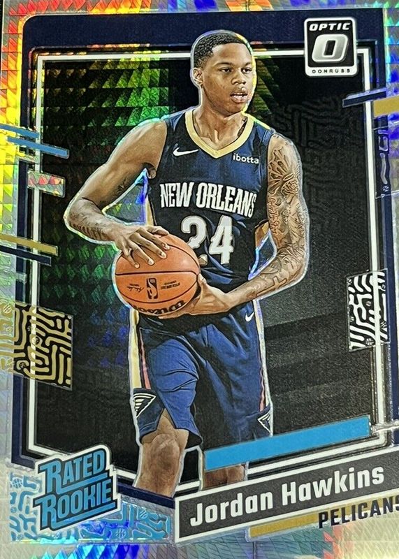 This card is 1 of 79 Jordan Hawkins' card variations in the 2023 Optic set being tracked by Sports Card Investor, including Base, Blue Velocity, Checkerboard, Choice Red & Green, and Fast Break.