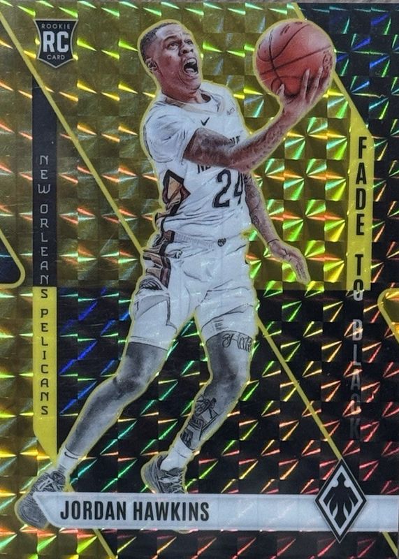 The Jordan Hawkins 2023 Phoenix #24 Fade to Black - Gold /10 Rookie card in Raw condition has not changed in price in the last 30 days and was last sold for $12.50 .
