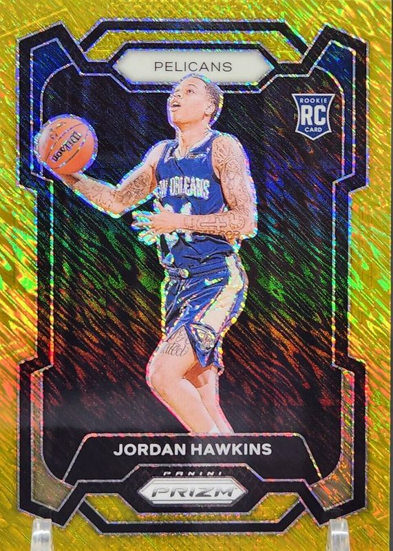 The Jordan Hawkins 2023 Prizm #130 Gold Shimmer /10 Rookie card in Raw condition has not changed in price in the last 30 days and was last sold for $310.00 .