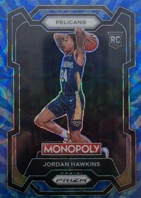 The Jordan Hawkins 2023 Prizm Monopoly #56 Boardwalk Blue Tiger Stripe Rookie card in Raw condition has not changed in price in the last 30 days and was last sold for $15.50 .