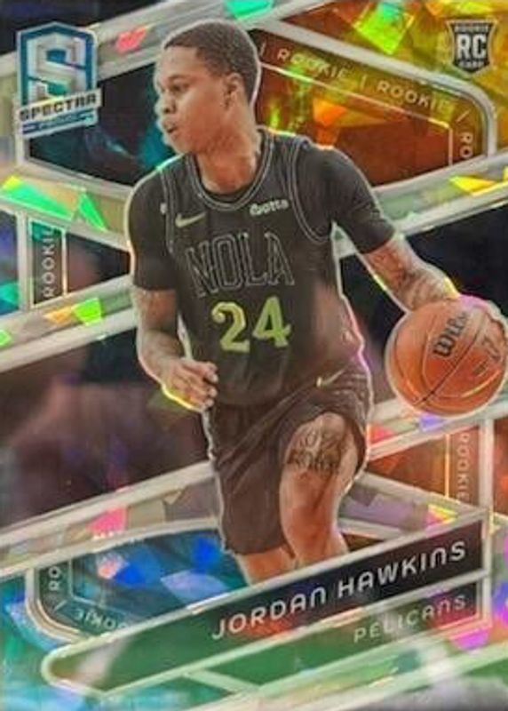 This card is 1 of 55 Jordan Hawkins' card variations in the 2023 Spectra set being tracked by Sports Card Investor, including Base, International, International Black & White, International Red, and Menagerie.