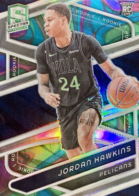 This card is 1 of 55 Jordan Hawkins' card variations in the 2023 Spectra set being tracked by Sports Card Investor, including Base, International, International Black & White, International Red, and Menagerie.