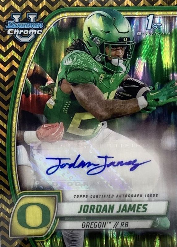 This card is 1 of 14 Jordan James' card variations in the 2024 Bowman Chrome University set being tracked by Sports Card Investor, including Prospect Auto (1st), Prospect Auto - Stealth Refractor (1st), Prospect Auto - Refractor /299 (1st), Prospect Auto - Fuchsia Refractor /150 (1st), and Prospect Auto - Green Refractor /99 (1st).