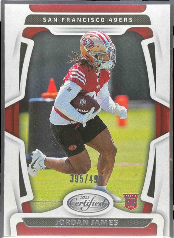 The Jordan James 2025 Certified #187 Base Rookie /499 card is 1 of 30 Jordan James' card variations in the 2025 Certified set being tracked by Sports Card Investor, including Rookies - Mirror /399, Rookies - Mirror Purple /299, Rookies - Mirror Pink /225, Rookies - Mirror Orange /150, and Rookie Roll Call Signatures /125.