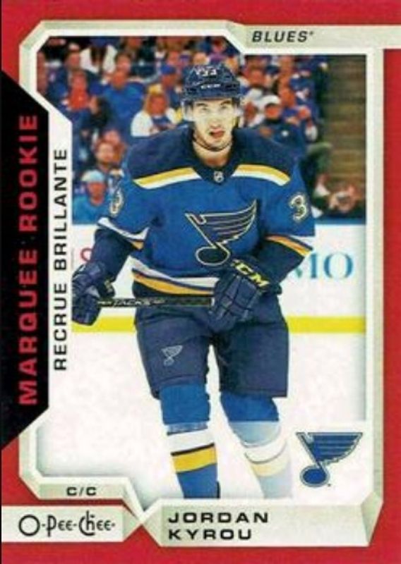The Jordan Kyrou 2018 Upper Deck #621 2018 O-Pee-Chee Update - Red Rookie card is 1 of 28 Jordan Kyrou's card variations in the 2018 Upper Deck set being tracked by Sports Card Investor, including Young Guns Base, Young Guns Canvas, Young Guns - Clear Cut, Young Guns - Jumbo, and Young Guns - Silver Foil.